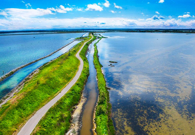 Nel secondo giorno di tour ritorneremo a Ravenna, ma costeggiando la costa adriatica, percorreremo la nuova ciclabile, che attraversa un tratto delle Valli di Comacchio su una striscia di terra contornata dall’acqua, fino a giungere alle spiagge di Marina di Ravenna, dove prenderemo la ciclabile che ci riporterà al punto di partenza.