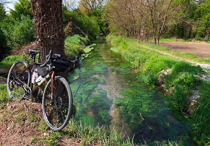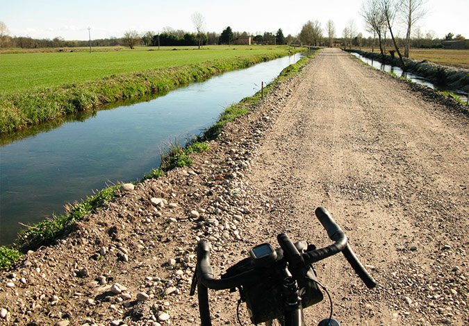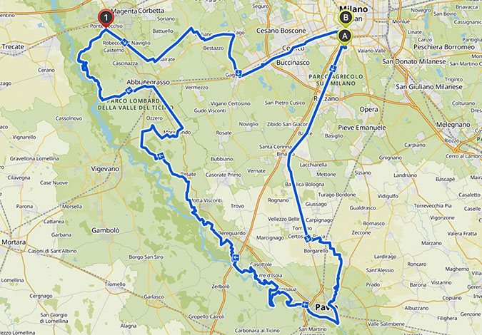 Percorso ad anello da fare in giornata per “gravellisti” allenati. Partenza da Milano, seguiremo la ciclabile del Naviglio Pavese fino alla Certosa di Pavia, da qui per strade di campagna fino a Pavia. Si risale poi il Ticino tra single track nei boschi e sterrati: si giungerà prima al ponte di barche di Bereguardo poi all'Abbazia di Morimondo. Tireremo brevemente il fiato seguendo la strada asfaltata del Naviglio di Bereguardo fino ad Abbiategrasso dove decideremo se ritornare verso Milano o giocarci le ultime energie su un bellissimo single track nel bosco, prima di imboccare strade di campagna che ci porteranno a Gaggiano e poi lungo il Naviglio fino alla “movida” di Milano per la meritata birra ghiacciata.